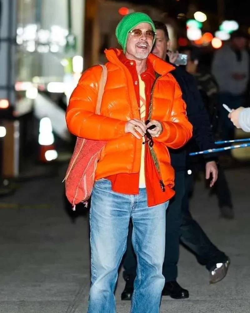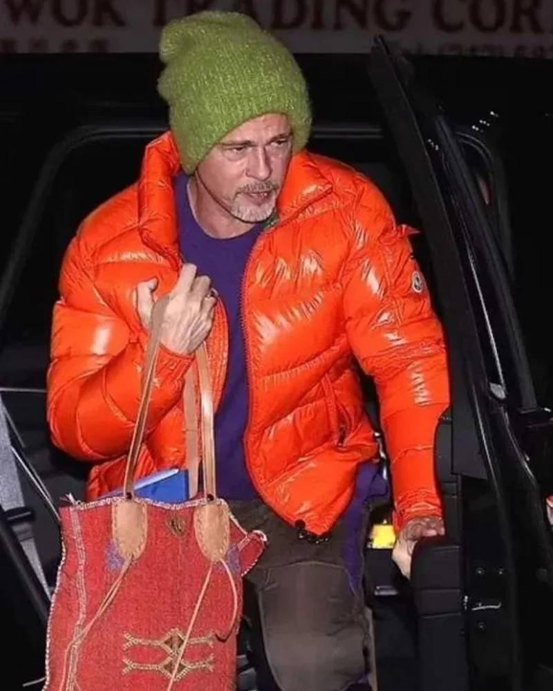Wolfs 2024 Movie Brad Pitt Orange Puffer Jacket