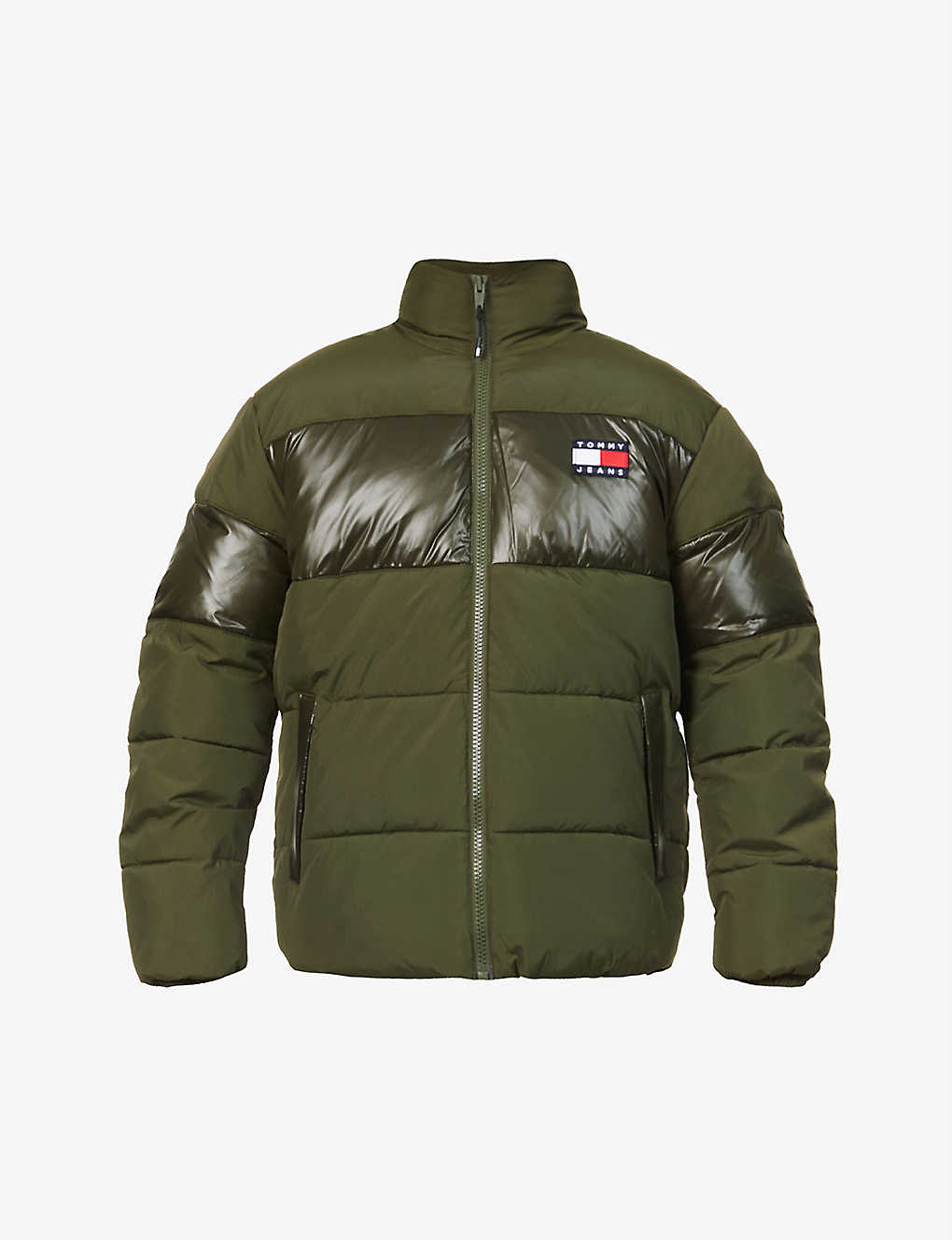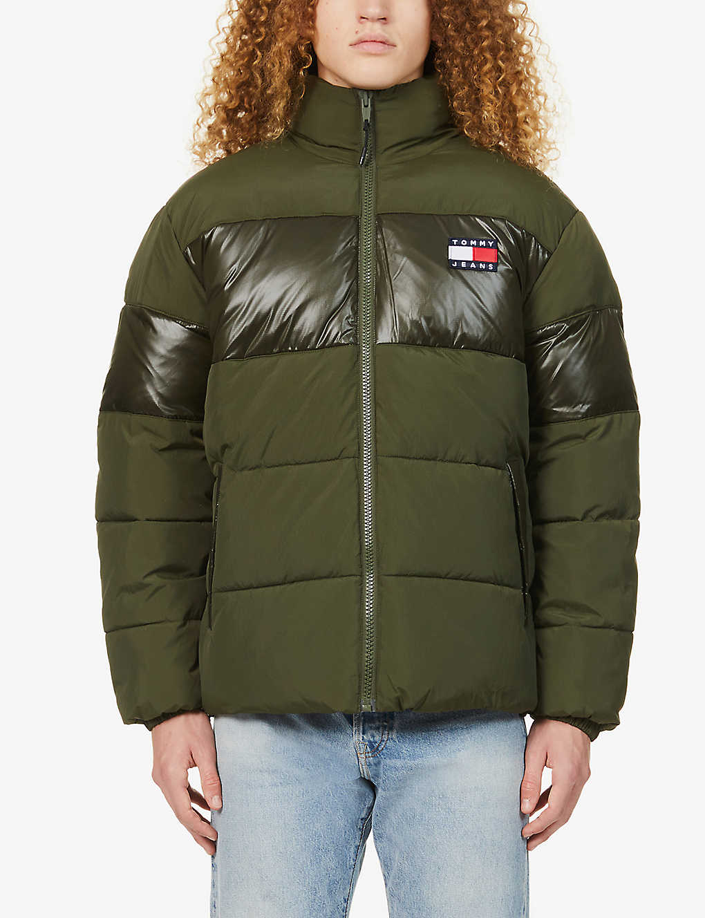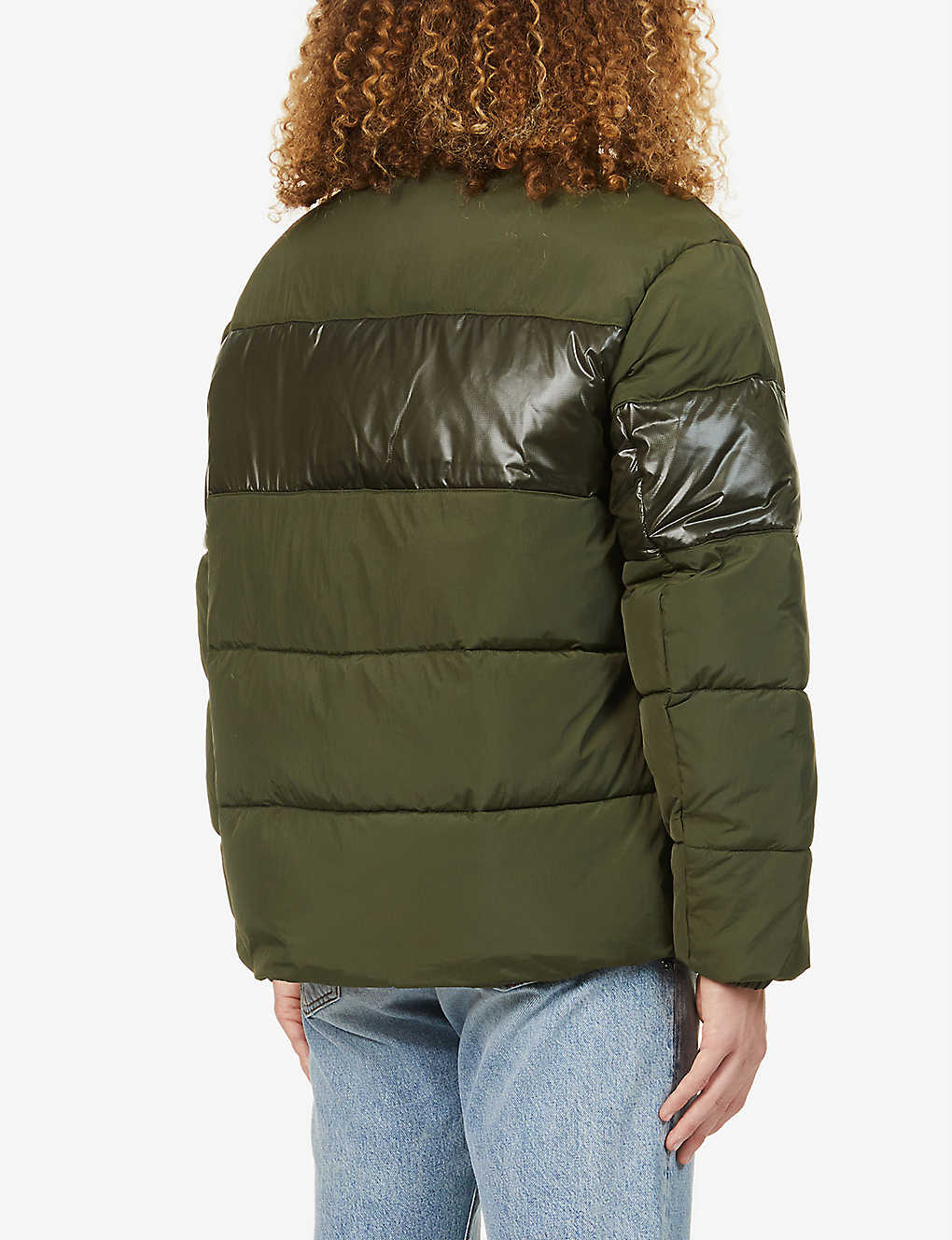 Contrasting Panel Logo Patch Shell Green Puffer Jacket