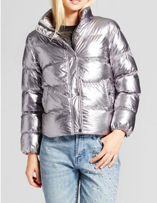 Metallic Silver Poly Puffer Jacket with Snap Tab Buttoned Closure
