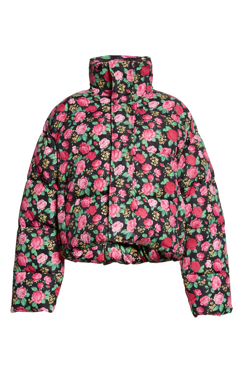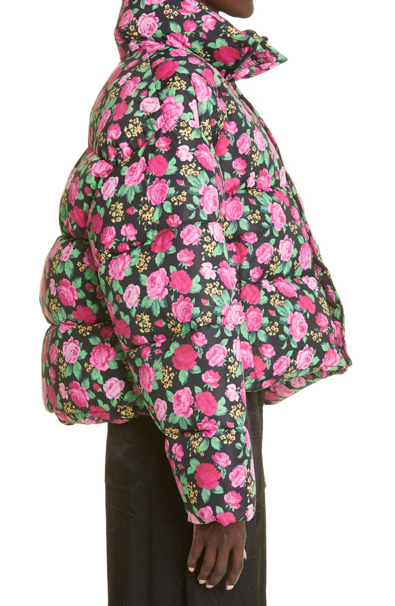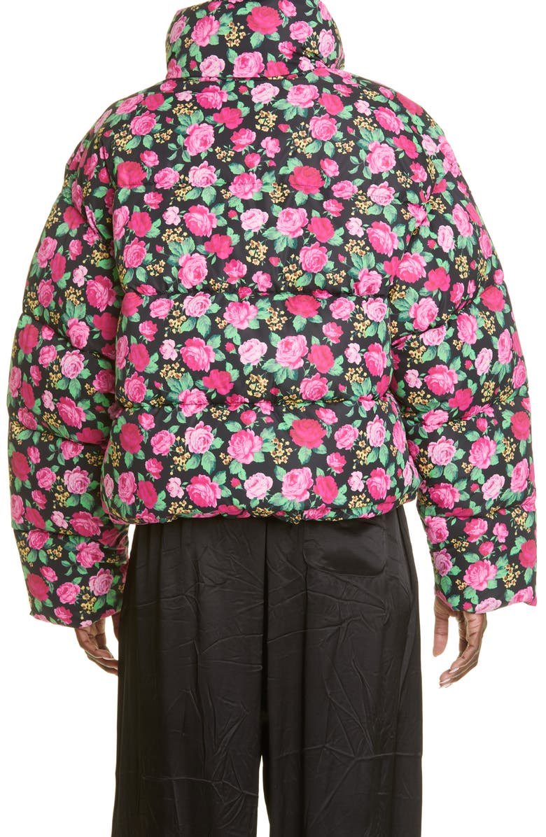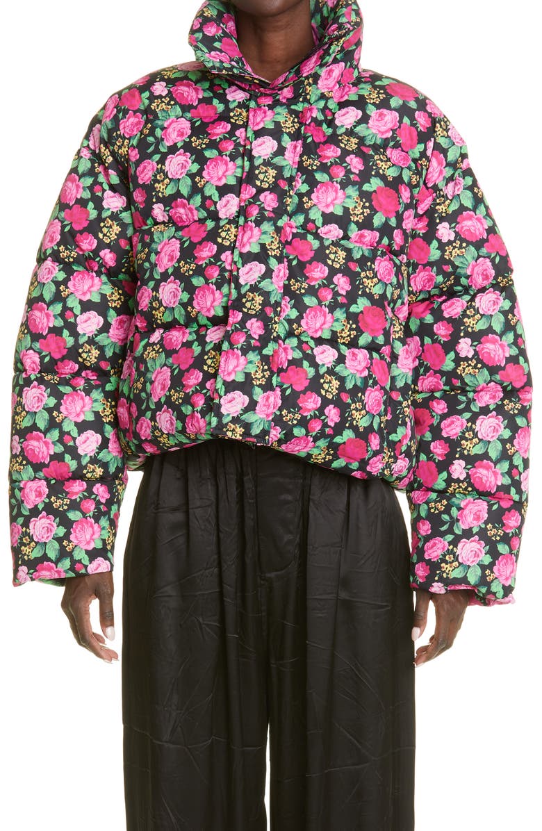 Rose Nylon Floral Printed Cocoon Puffer Jacket For Women